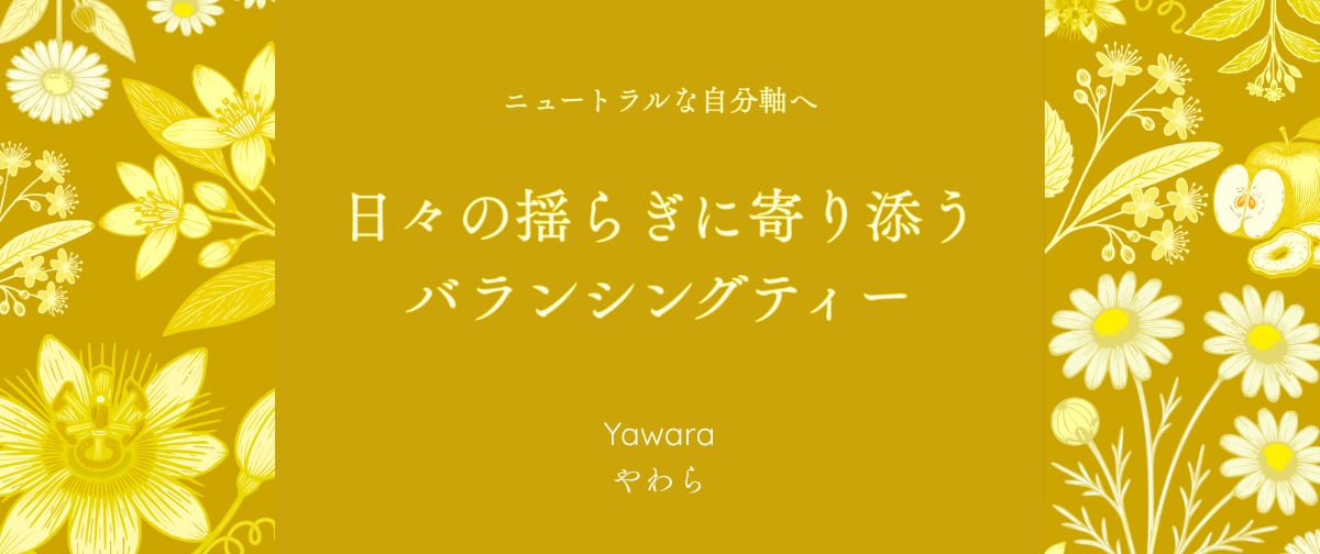 忙しい毎日の中で、 気づかないうちに 心と体のリズムは乱れがち。 Yawara(やわら)は、 そんな揺らぎをやさしく整える バランシングブレンドです。 【Blend Concept】 五行エレメント:土・土用 土のエレメントは、 心と体のバランスを整え、 安定した土台をつくる働きを象徴します。 Yawaraは、 ゆらぎをしなやかに受け止め、 穏やかな調和へと導くことを イメージしてブレンドしました。 カモミールとオレンジフラワーの フローラルな香りとやさしい甘さが 張り詰めた感覚をやさしくゆるめます。 【内容量】 ・ティーバッグ:2.5g×16包 ・リーフタイプ:60g Mサイズは毎日の習慣に、約一か月分 目安:TB1包ティーカップ2杯分 【原材料】 カモミール・ジャーマン、パッションフラワー、リンデン、ドライアップル、カレンデュラ、オレンジフラワー、ステビア 【注意事項】 ・本品はリンゴを含みます。リンゴのアレルギーをお持ちの方はご注意ください。 ・本品はキク科植物を含みます。キク科アレルギーのある方はご注意ください。 ・本品はオレンジフラワーを含みます。吐き気をともなう頭痛、妊娠中の方はご注意ください。 ゆらぎを整えるバランシングティー