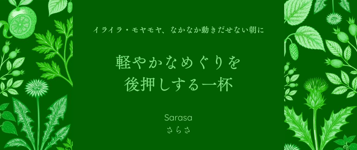 朝、目は覚めているのに、 なんだかスッキリしない。 Sarasa(さらさ)は、 心と体の巡りに寄り添い、 軽やかなスタートを後押しします。 【Blend Concept】 五行エレメント:木・春 木のエレメントは、生命のエネルギーを のびやかに巡らせることを象徴します。 Sarasaは、心と体の巡りを整えながら、 軽やかな流れを取り戻すことを イメージしました。 パウダリーで清々しいヨモギの風味と マルベリーリーフやネトルのコク。 ほのかに香ばしさも感じられ、 味わい深さを感じるブレンドです。 【内容量】 ・ティーバッグ:2.5g×16包 40g ・リーフタイプ:60g 目安:TB1包でティーカップ2杯分 Mサイズは毎日の習慣に、約一か月分 【原材料】 ダンディライオン、ミルクシスル、マルベリーリーフ(日本)、オレンジピール、ネトル、ヨモギ(日本)、ローズヒップ 【注意事項】 ・本品はオレンジを含みます。オレンジのアレルギーをお持ちの方はご注意ください。 ・本品はキク科植物を含みます。キク科アレルギーのある方はご注意ください。 スムーズに始めたいときの後押しに。